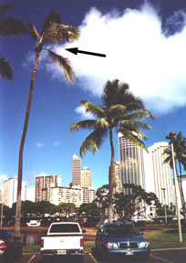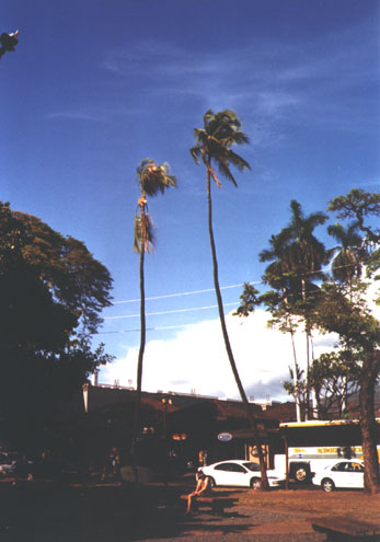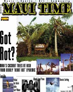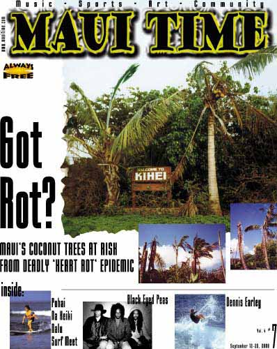 The dead palm shown on the cover, a victim of the disease, is located at the North Kihei Road entrance to Kihei. Infected trees have also