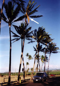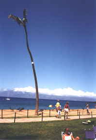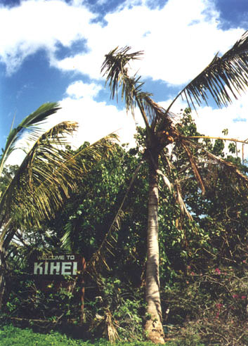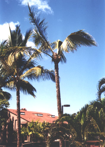 The disease started in the 1980's on the windward sides of the islands where its growth was aided by the heavier rainfall there. In the 1990's the disease began to appear in the arid areas of Maui. The dead palm in the photo below, a victim of the disease, is located at the North Kihei Road entrance to Kihei. Infected trees have been found in Maui Meadows, Wailea and West Maui.