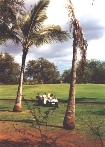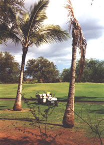In the meantime, an education and injection program has been put together by Hawai`i Coconut Protectors to help protect the palms from contracting the disease. Seminars, Presentations to both the Landscaping and Tourism Industry have been held. Many private owners, hotels and resorts, golf courses, restaurants, condos have already protected their trees. The collaboration and support of residents is needed to stop the further spread of the disease. Because of the large population of coconut palms, as well as the fact that they do not show any outside noticeable symptoms until they are dead and usually cut down, the disease has been allowed to spread and remain unnoticed to the untrained eye. The reality is that we are starting to see landscaping like that of the picture on top, taken on the windward side of Maui. If we wait any longer, we will not be able to save our island heritage...