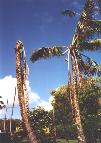 Preliminary research conducted on Kaua`i by the university showed that disease protection was being achieved by injection into the trunk of coconut trees. Unfortunately, this experiment was destroyed by Hurricane Iniki before the final results could be taken.