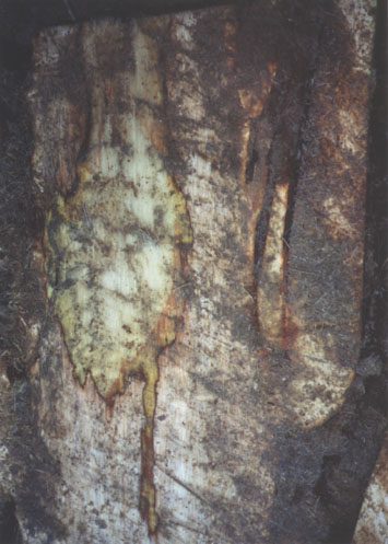 to the top of a nearby healthy tree where the fungus then moves down into the heart of the palm, producing a rot that slowly destroys the